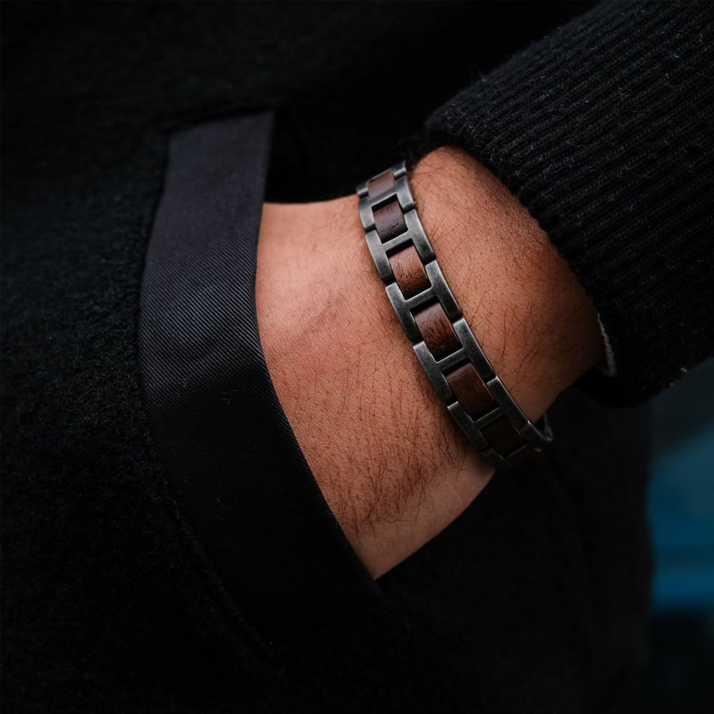 Das Holzkern Acoustic Herren Armband überzeugt durch seine zurückhaltende, zeitlose Ästhetik und ein besonders angenehmes Tragegefühl. Die Kombination aus 12 mm breiten Elementen aus hochwertigem 316L Edelstahl in Antiksilber und edlem Walnussholz verleiht diesem Bandlet eine warme, natürliche Ausstrahlung mit stilvollem Vintage-Charakter. Die feine Holzmaserung macht jedes Armband zu einem Unikat und unterstreicht die individuelle Note dieses besonderen Schmuckstücks.