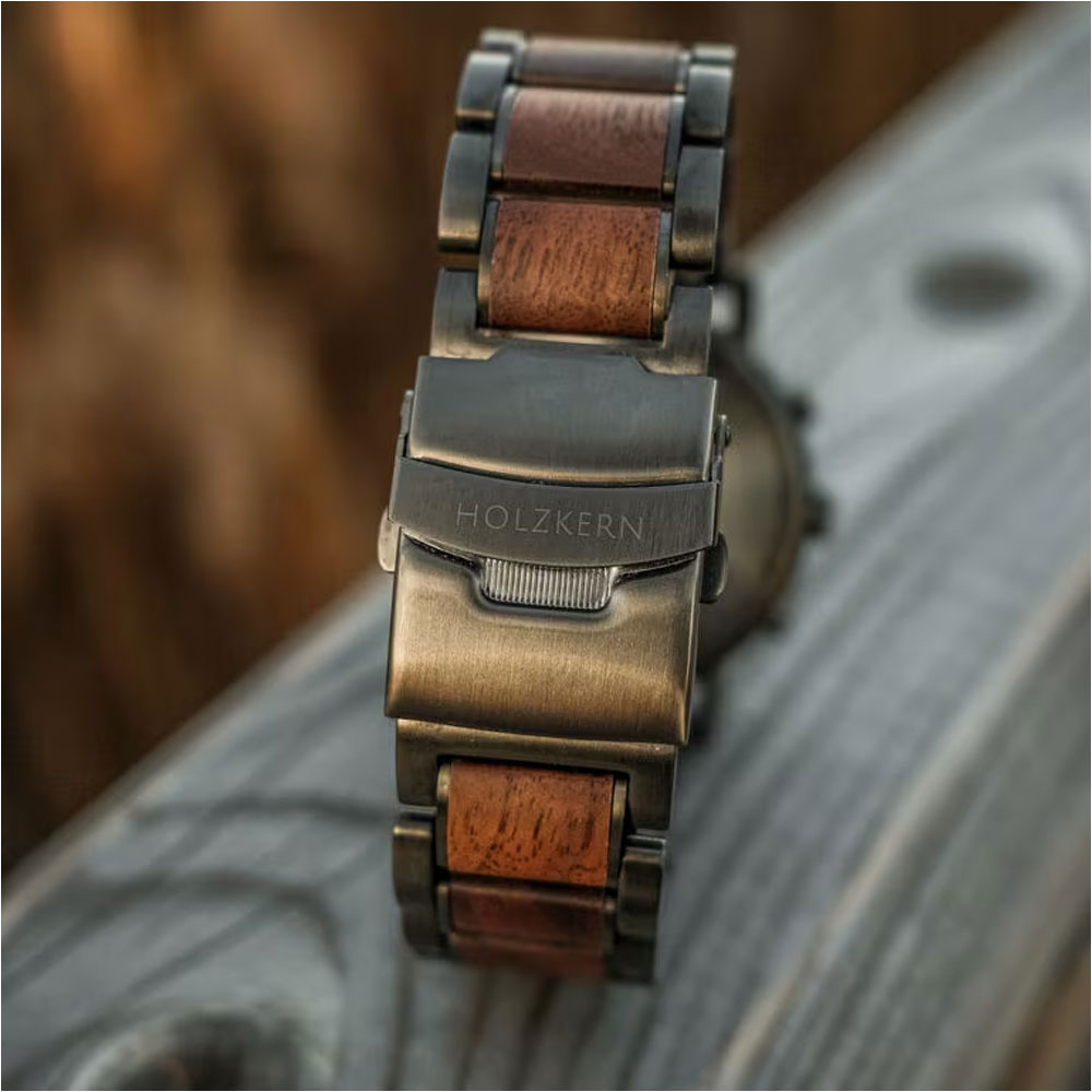 Das Armband aus Metall und Holz ist größenverstellbar und wird mit einem Klappverschluss mit Feineinstellung sicher fixiert. Die wechselbare Lünette, die solide Rückseite aus Metall sowie die hochwertigen Schrauben unterstreichen die Langlebigkeit und Detailverliebtheit dieses Modells. Mit einem Gewicht von 135 g und einer Gehäusehöhe von 12 mm sitzt die Uhr bequem am Handgelenk und vereint Komfort mit Stil.