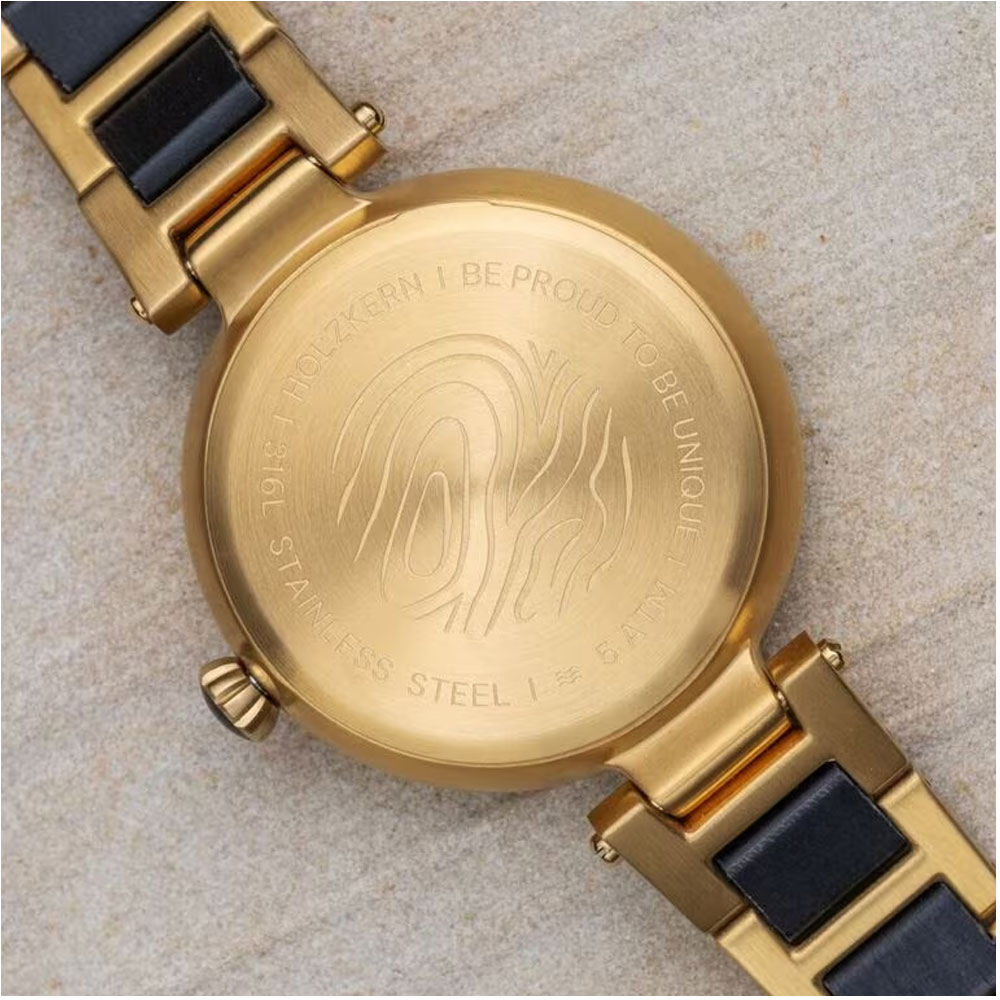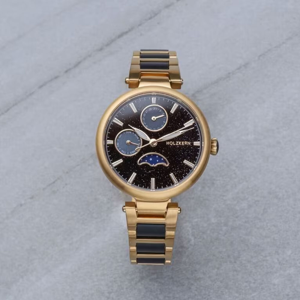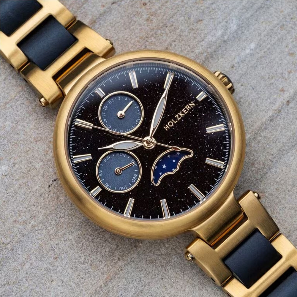 Das 32 mm Gehäuse aus vergoldetem Edelstahl liegt angenehm am Handgelenk und beherbergt ein Zifferblatt aus schwarzem Aventurin mit einzigartigen Strukturen sowie schwarzem Perlmutt in den Hilfszifferblättern. Die Uhr bietet Mondphasenanzeige, Wochentags- und Datumsanzeige und ist dank japanischem Luminova auch bei Dunkelheit hervorragend ablesbar. Mit einer Gehäusehöhe von 9,4 mm, einem Gewicht von 56 g und einer Armbandbreite von 15 mm vereint die Moonbow Komfort, Eleganz und Funktionalität. Das größenverstellbare Armband aus Ahornholz und Edelstahl in Gold passt sich jedem Handgelenk optimal an und wird mit einem Butterfly-Clasp sicher verschlossen.