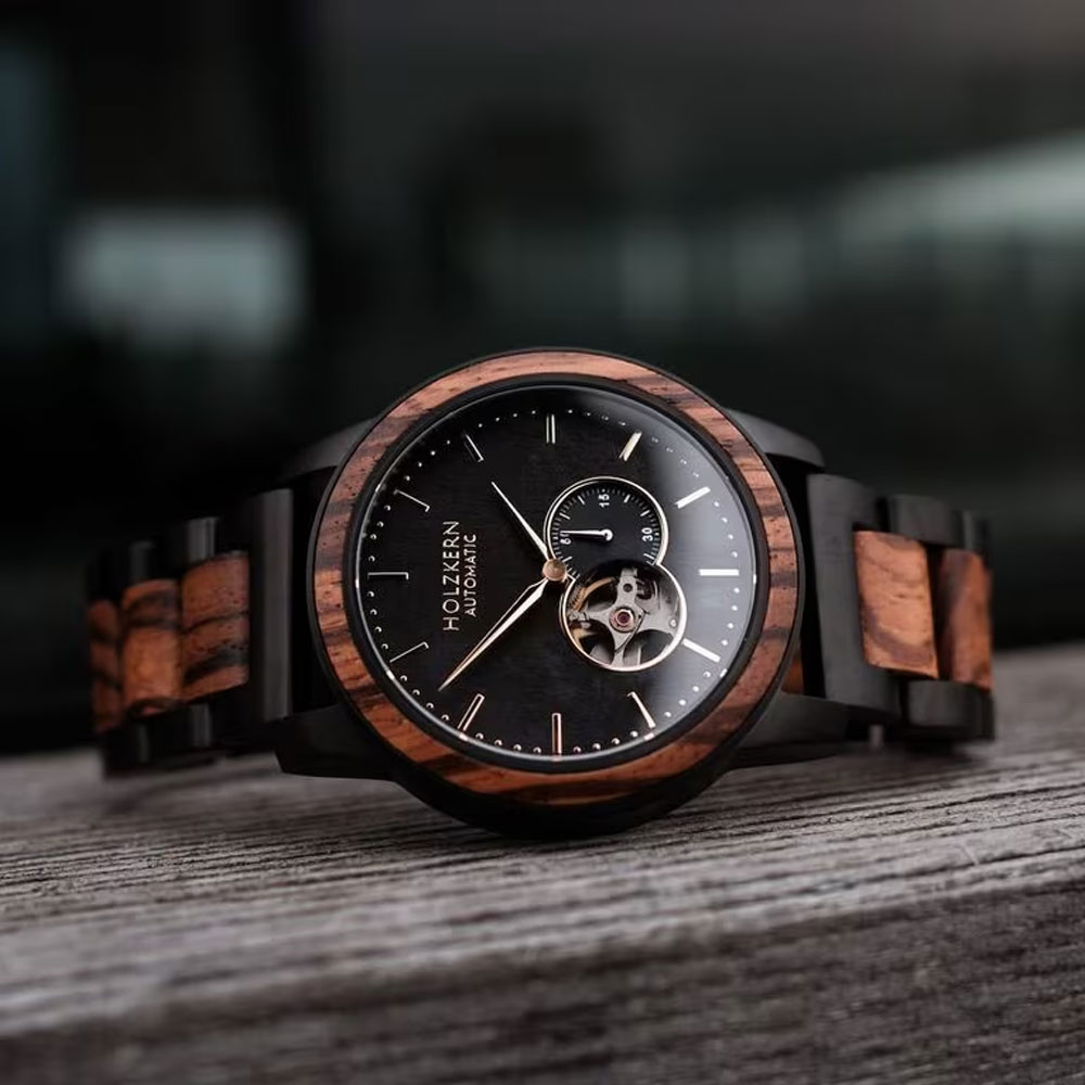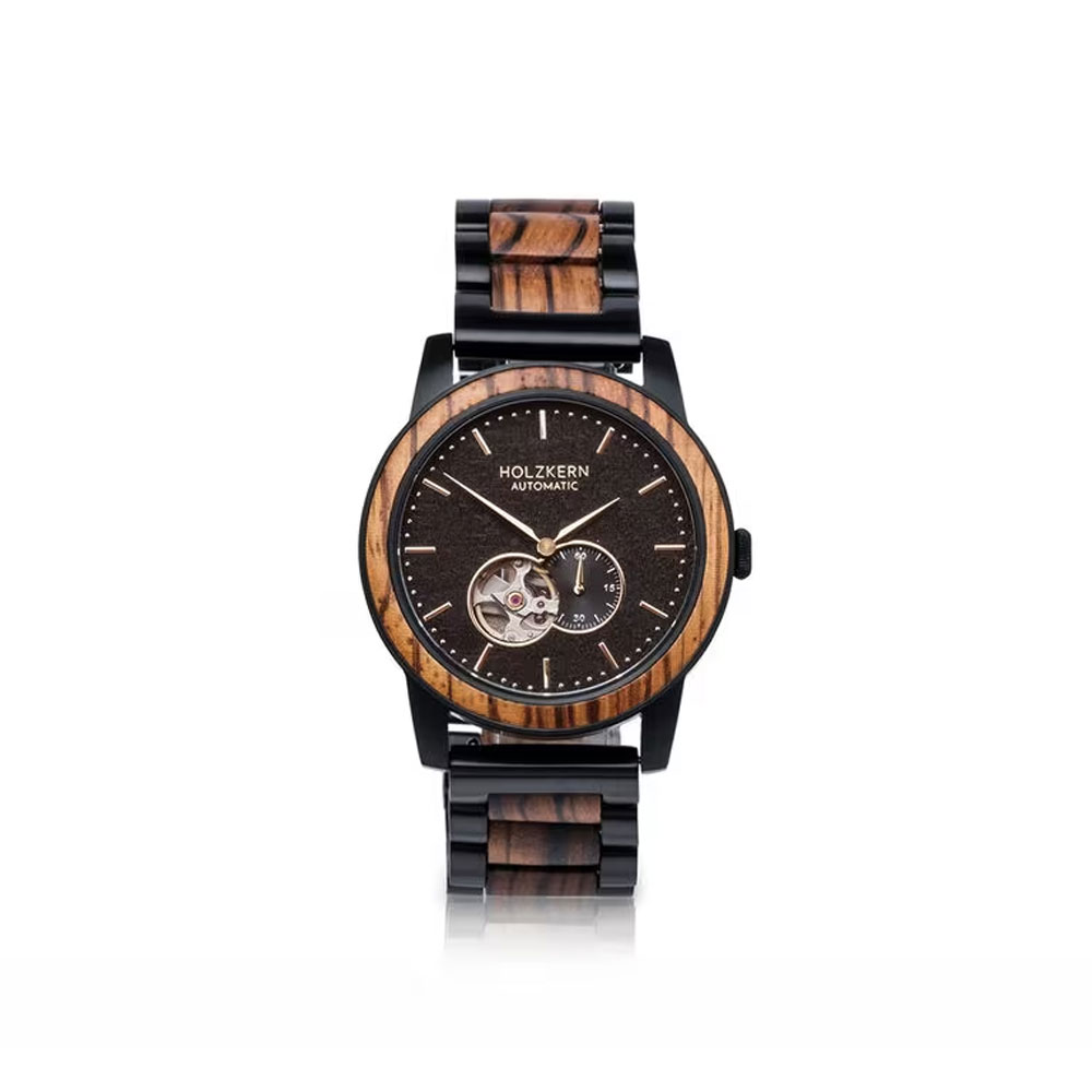 Das 43 mm große Gehäuse aus Zebranoholz und Edelstahl liegt mit 13 mm Gehäusehöhe und einem Gewicht von 141 g angenehm am Handgelenk. Im Inneren arbeitet ein präzises Automatikuhrwerk von Miyota (82S5), das für eine zuverlässige Ganggenauigkeit von ±20 Sekunden pro Tag sorgt. Geschützt wird das Zifferblatt durch kratzfestes Saphirglas, das für Langlebigkeit und klare Ablesbarkeit steht.