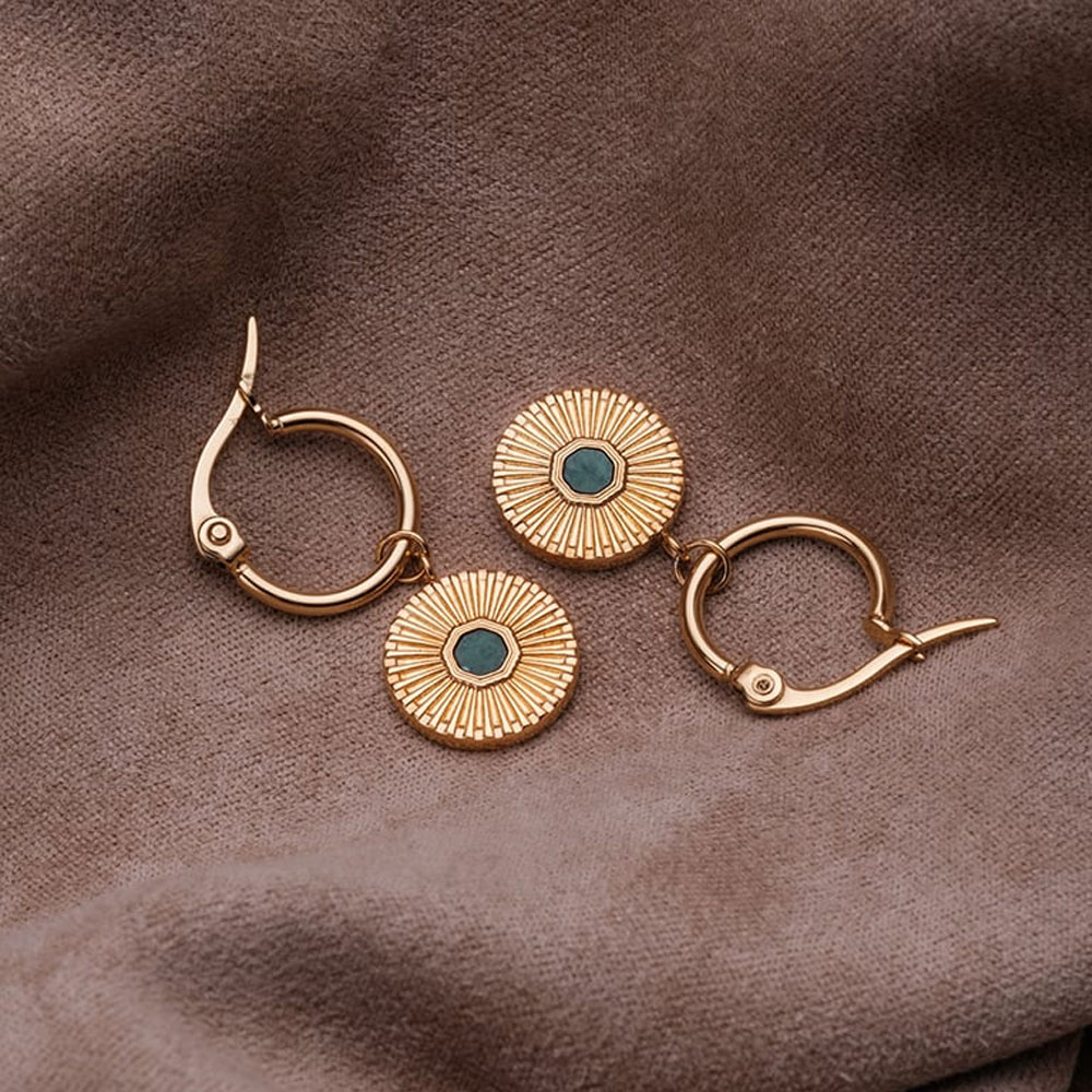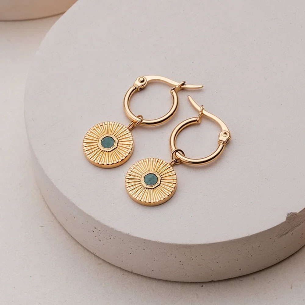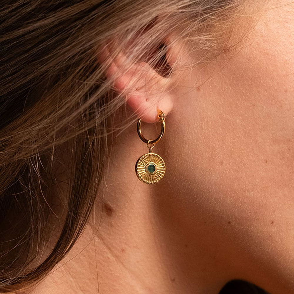 Die Ohrringe kombinieren echten, grünen Marmor mit 24k Gold vergoldetem 316L Edelstahl. Der Anhänger hat einen Durchmesser von 12 mm, die Creolen messen 10 mm, sodass sie elegant am Ohr sitzen und einen auffälligen Akzent setzen.