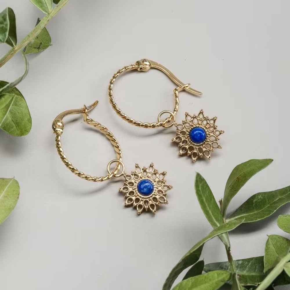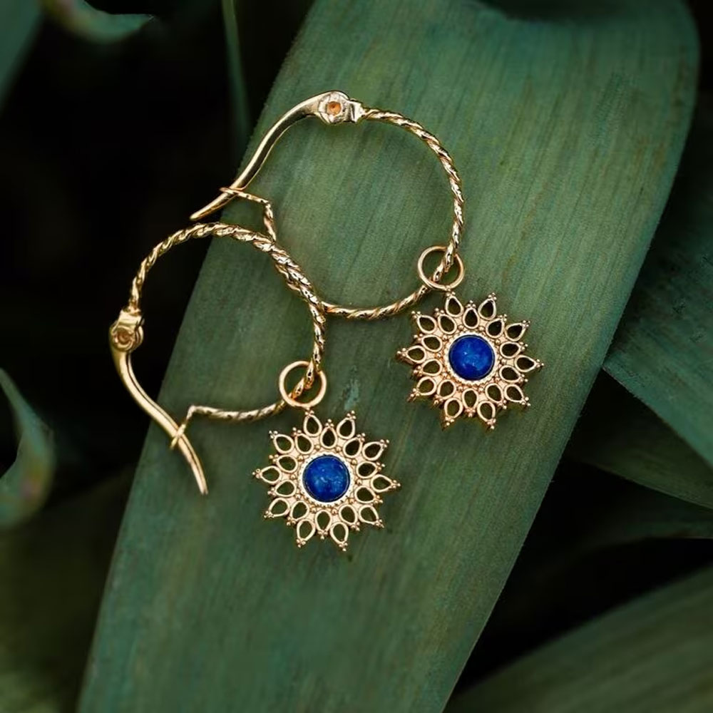 Holzkern Suncatcher Damenohrringe Lapislazuli & Gold – Strahlende Sonnenblumen für dein Outfit