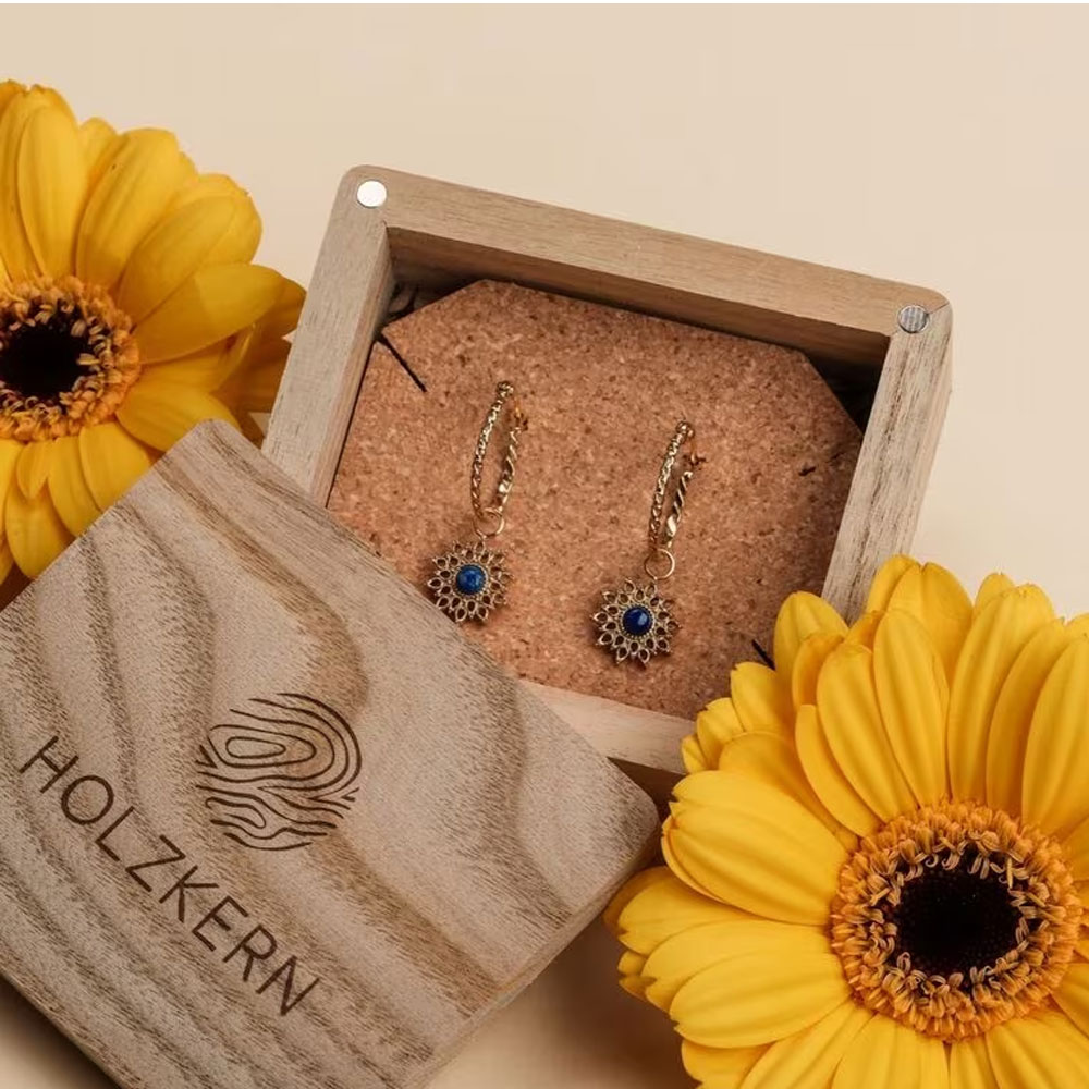 Holzkern steht für die harmonische Verbindung von Natur, Design und Qualität. Die Suncatcher Damenohrringe Lapislazuli & Gold sind ein auffälliges Statement für alle, die Sonne, Stil und Persönlichkeit lieben.