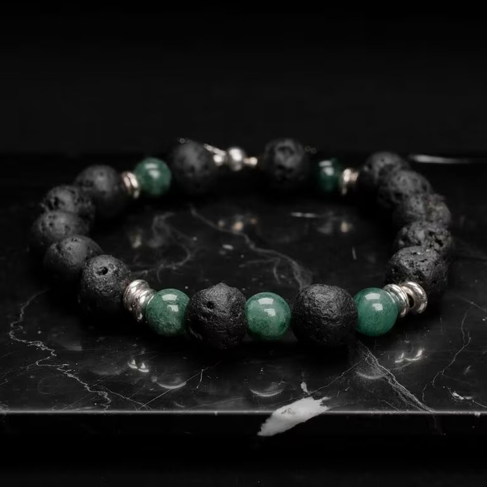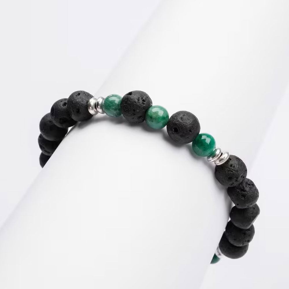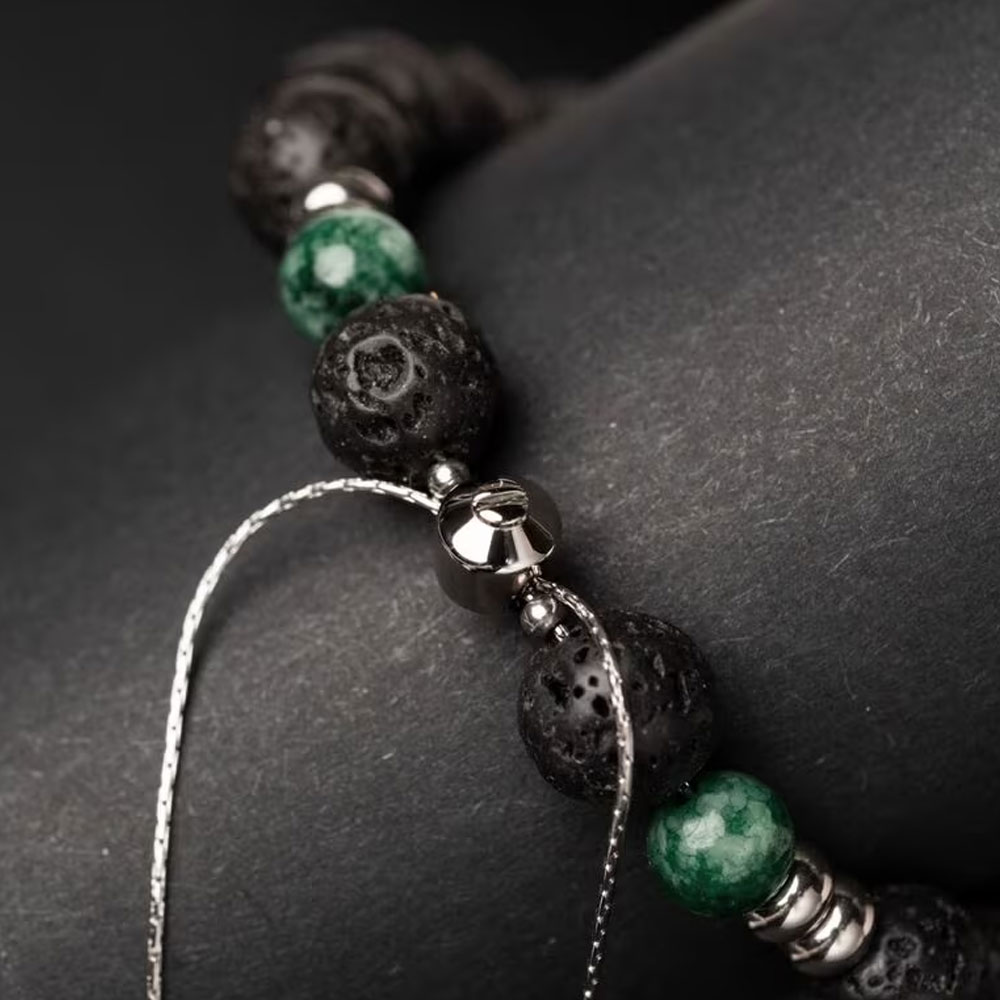 Die Perlen bestehen aus echtem, grünem Marmor und schwarzem Lavagestein in den Größen 8mm und 6mm. Verbindendes Element ist robuster 316L Edelstahl in Silber. Das Armband ist mindestens 17,3 cm lang und dank sorgfältiger Verarbeitung wasserfest, sodass du es jederzeit tragen kannst.